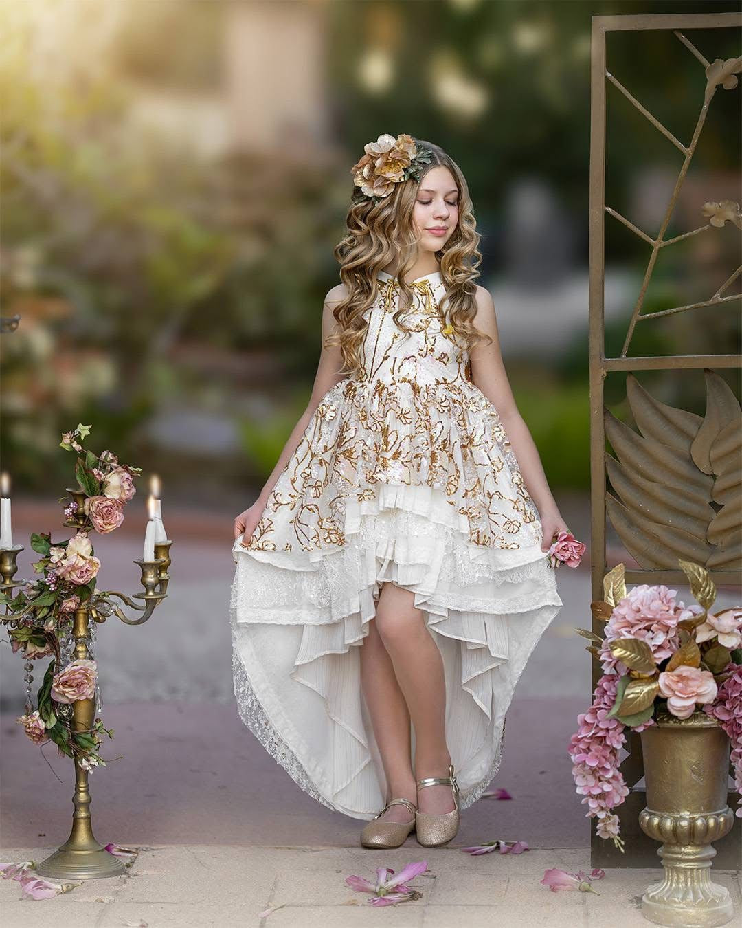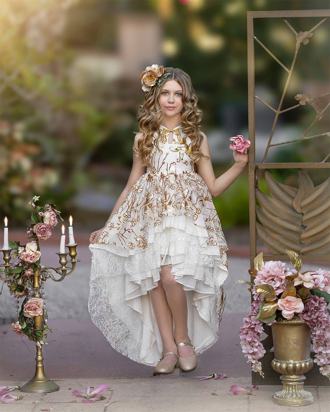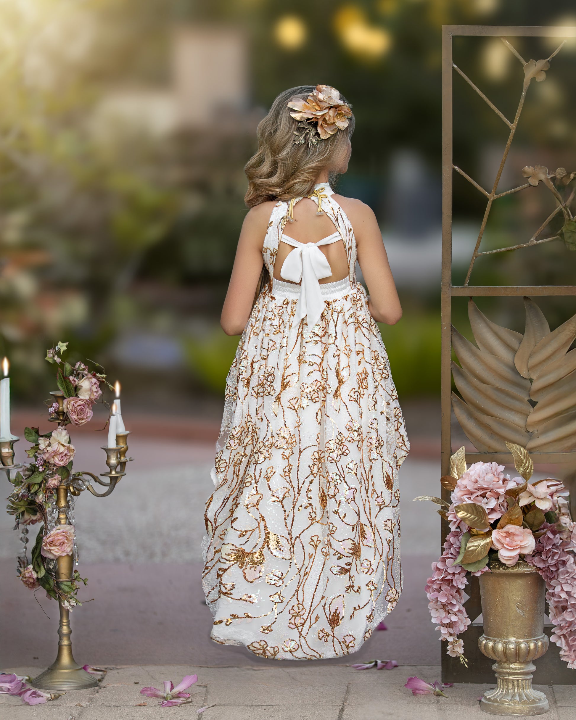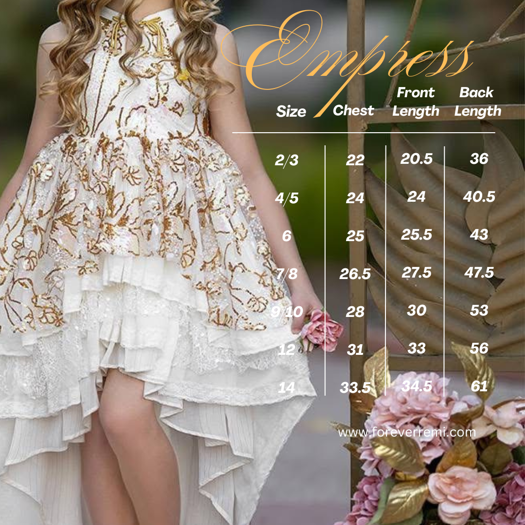Combining unique original details with our signature hi low design, this 2026 Lucky dress design is a true work of art. Shimmering sequins in gold and pink hues adorn a cascading skirt, exuding sophistication and elegance. This East meets West inspired dress is perfect for celebrating the lunar new year or any special event, bringing prosperity and peace for the year ahead.