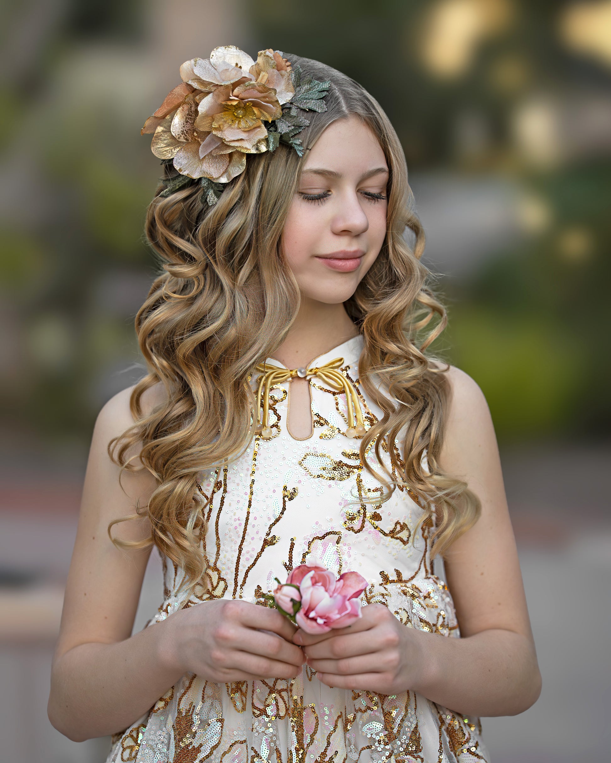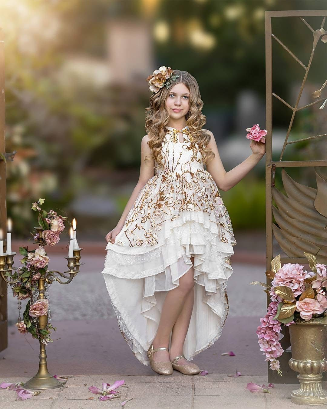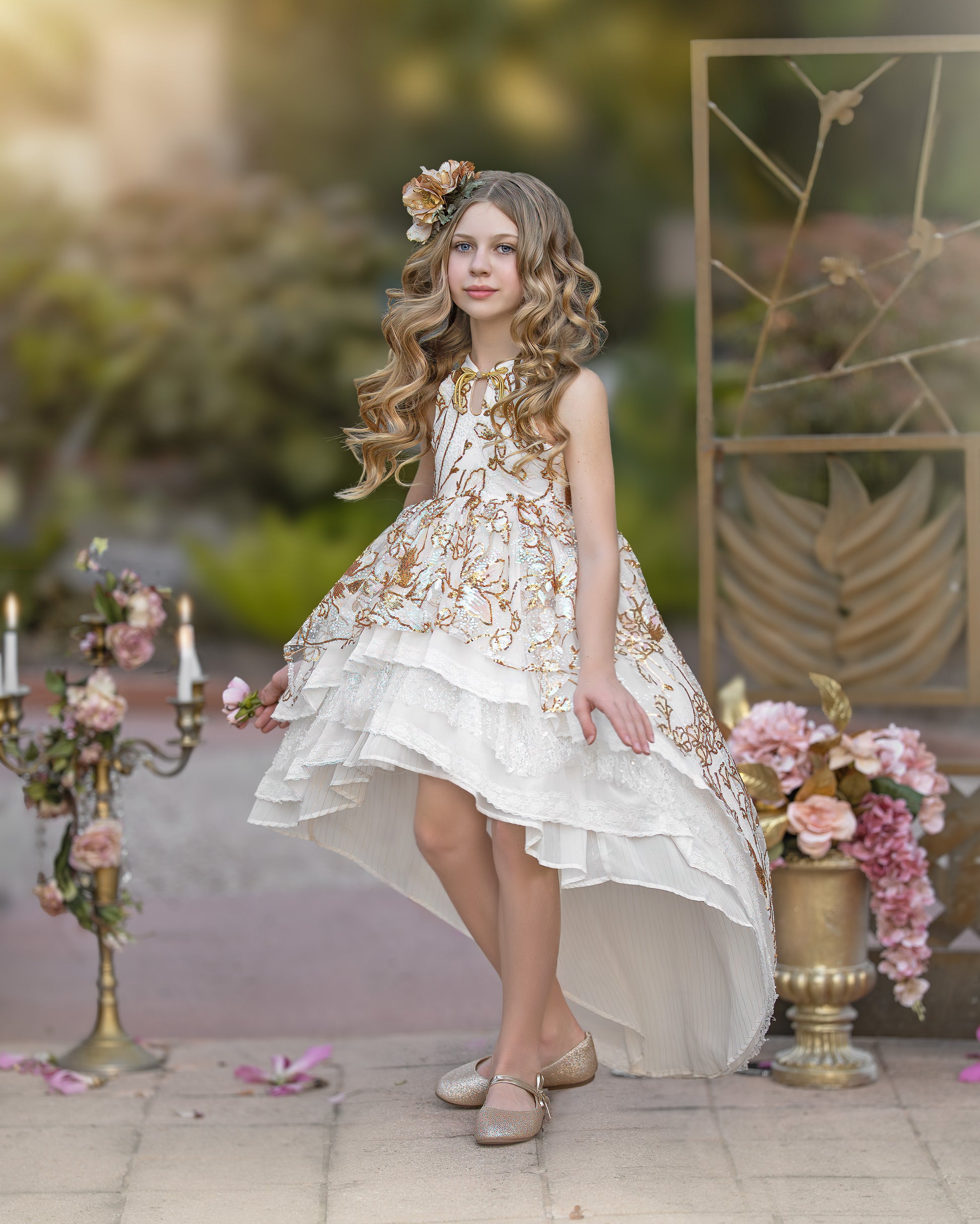 Combining unique original details with our signature hi low design, this 2026 Lucky dress design is a true work of art. Shimmering sequins in gold and pink hues adorn a cascading skirt, exuding sophistication and elegance. This East meets West inspired dress is perfect for celebrating the lunar new year or any special event, bringing prosperity and peace for the year ahead.