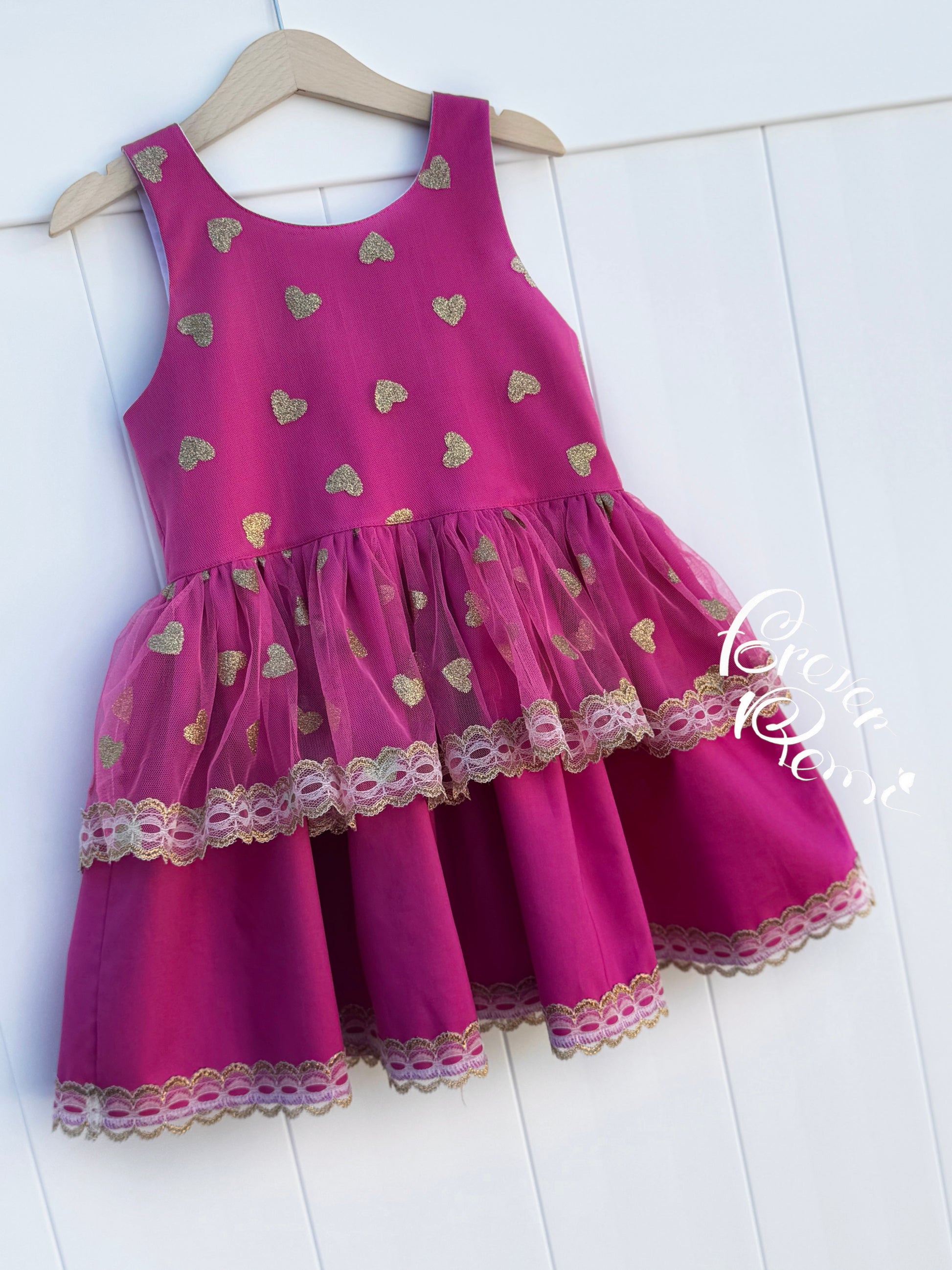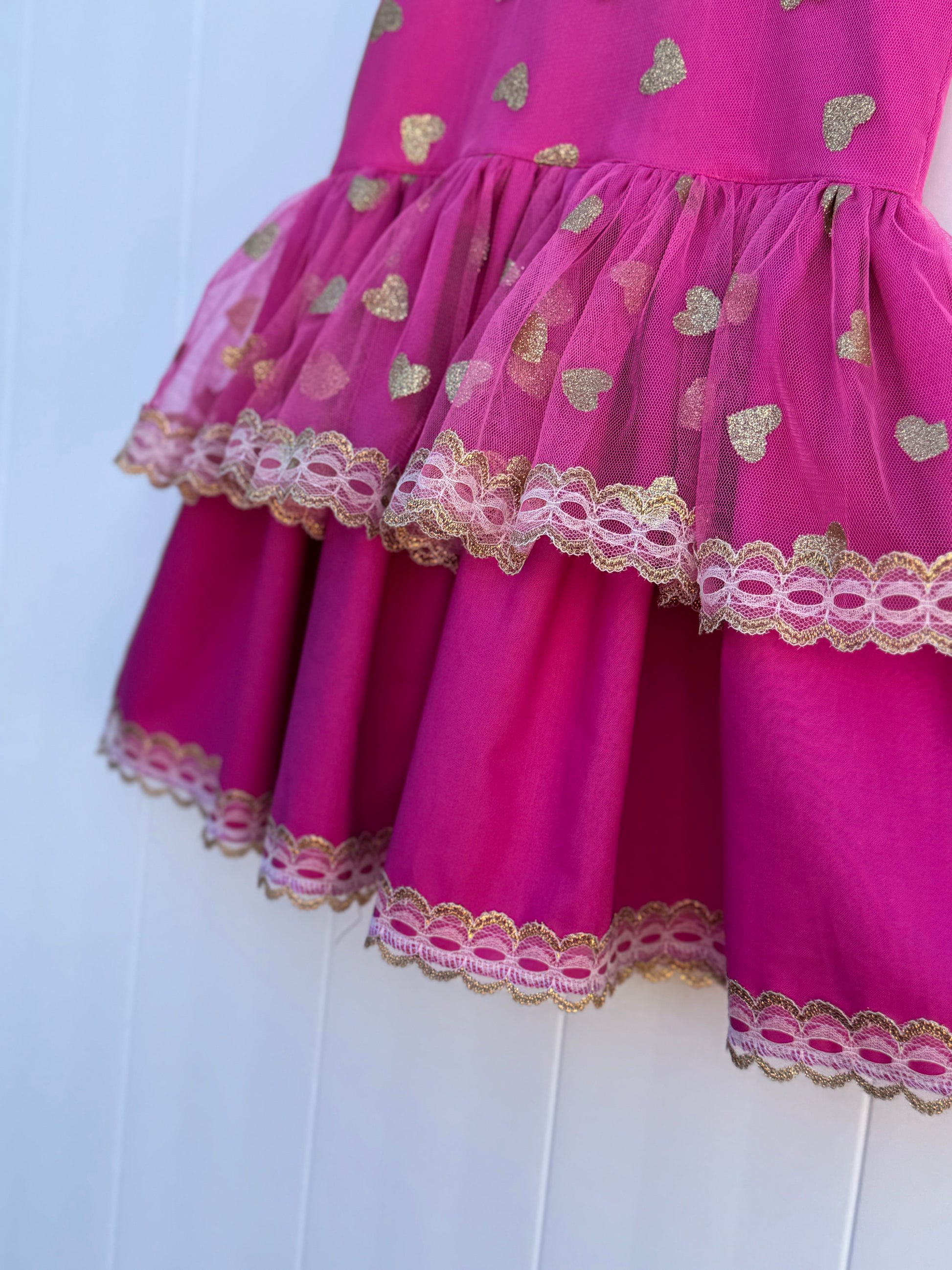 * Sleeveless design created with fun golden hearts tulle and gorgeous fuschia layered skirting trimmed in gold