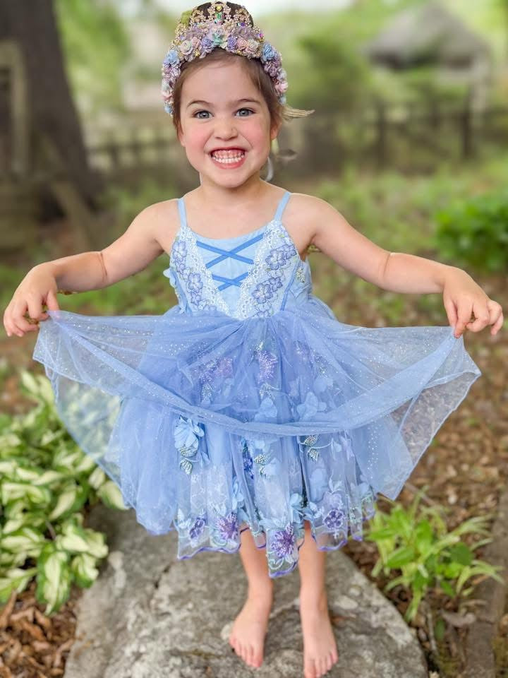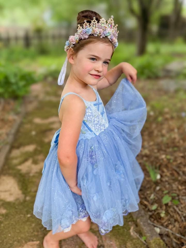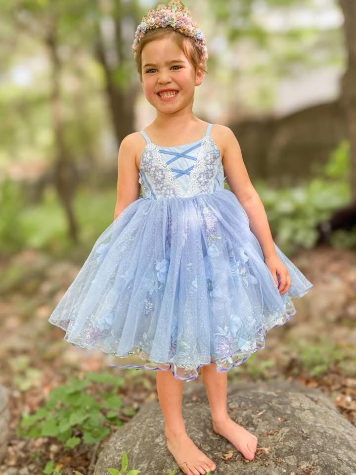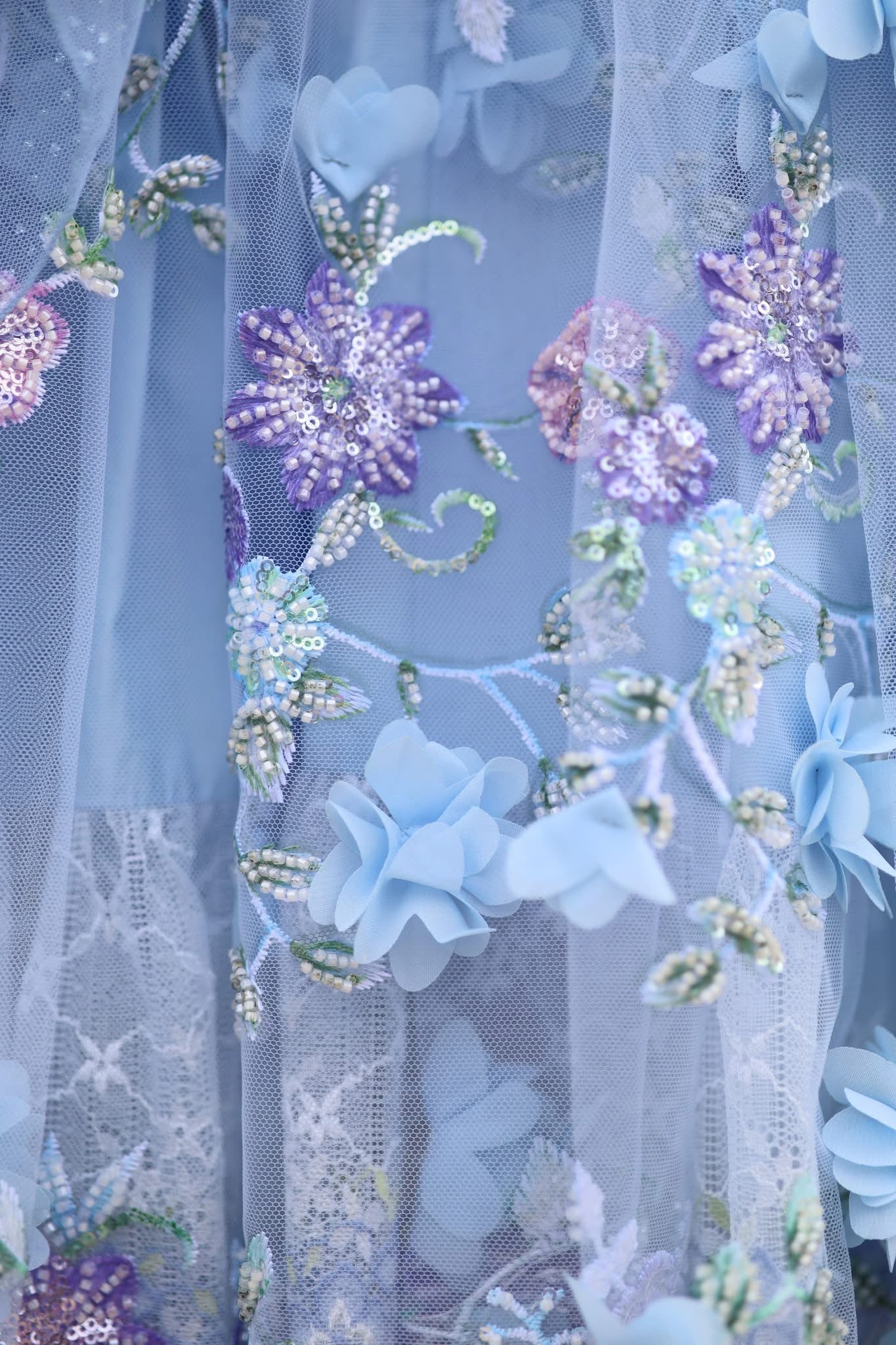 🩵 Multiple skirt design featuring sparkly tulle, special 3d sequin embroidered mesh, and a lace ruffle underskirt