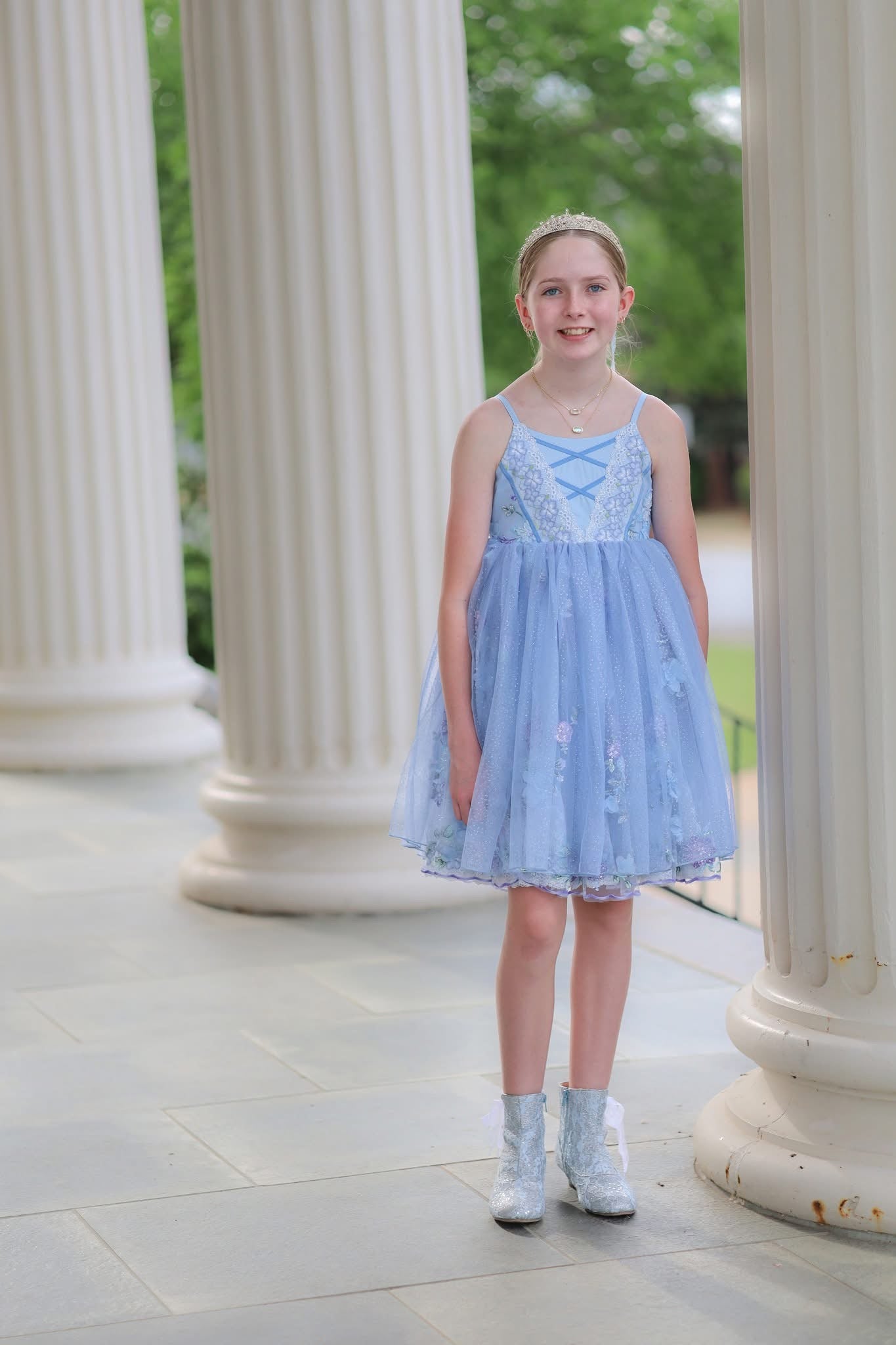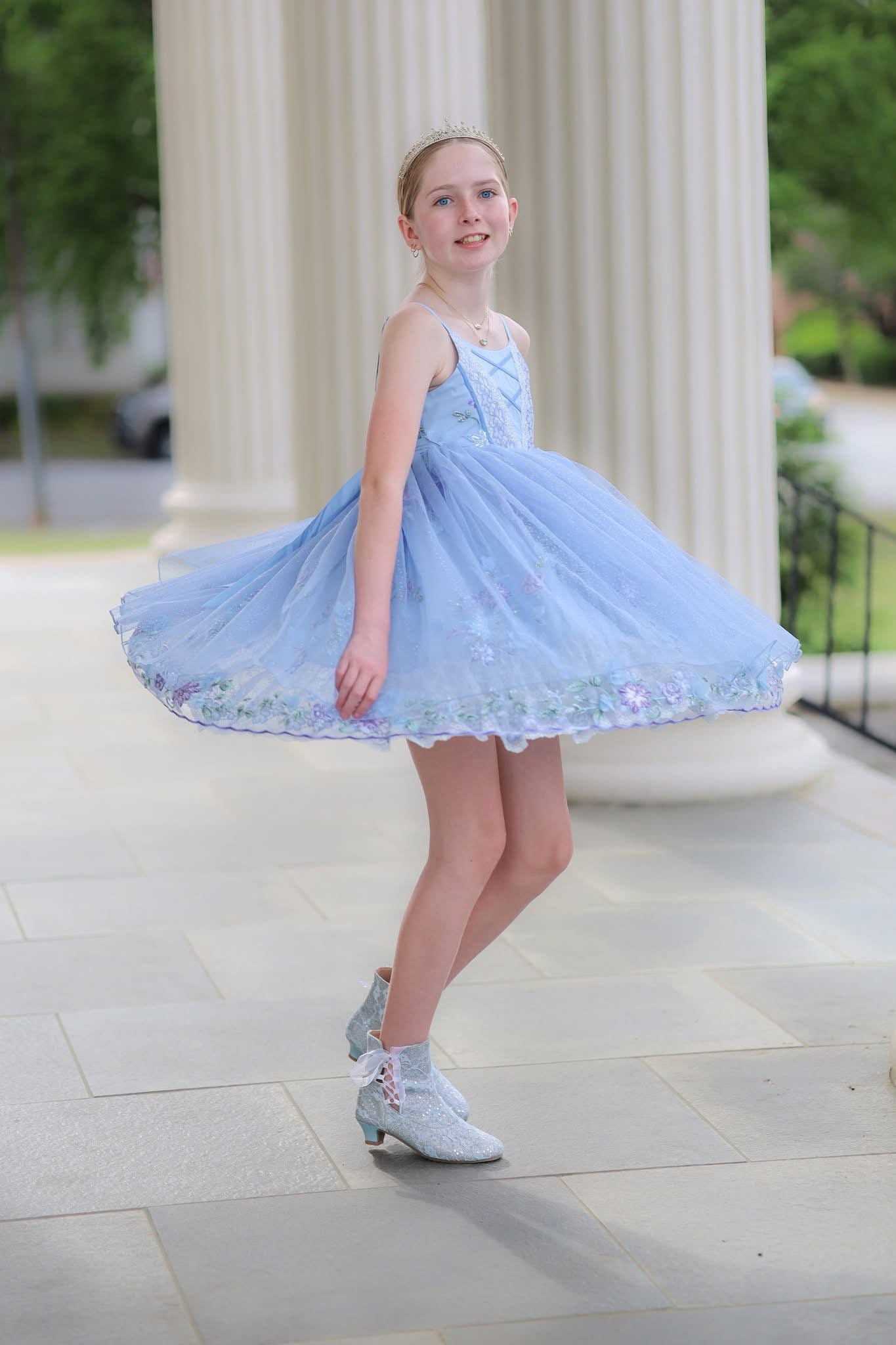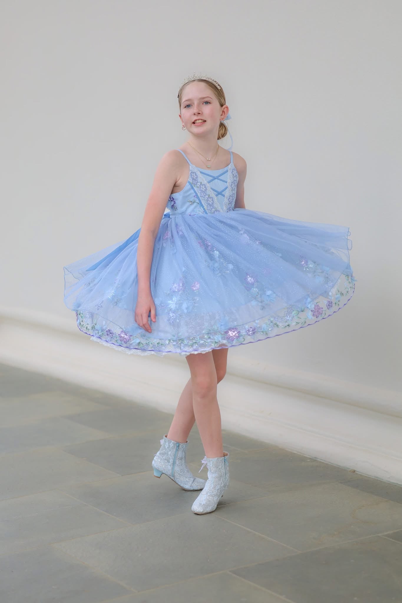 🩵 Multiple skirt design featuring sparkly tulle, special 3d sequin embroidered mesh, and a lace ruffle underskirt