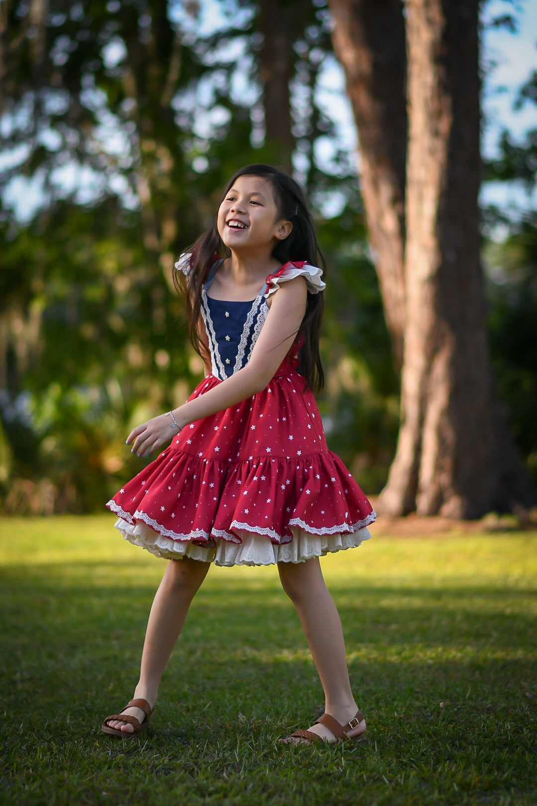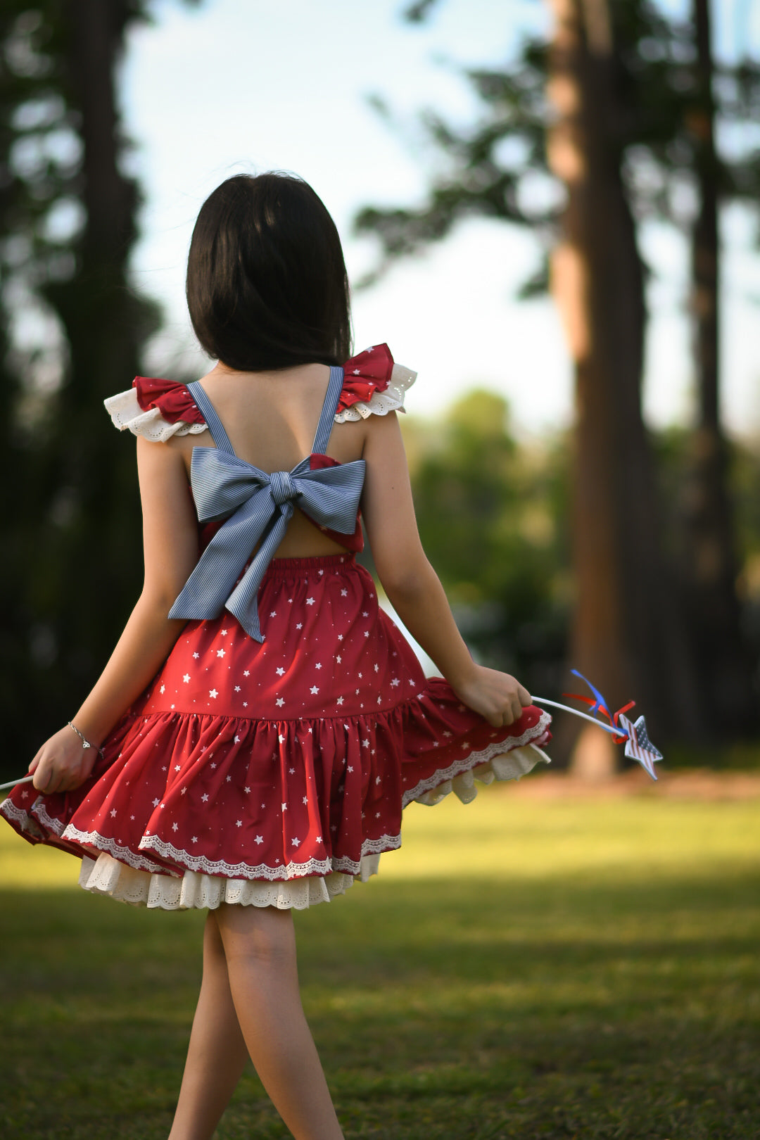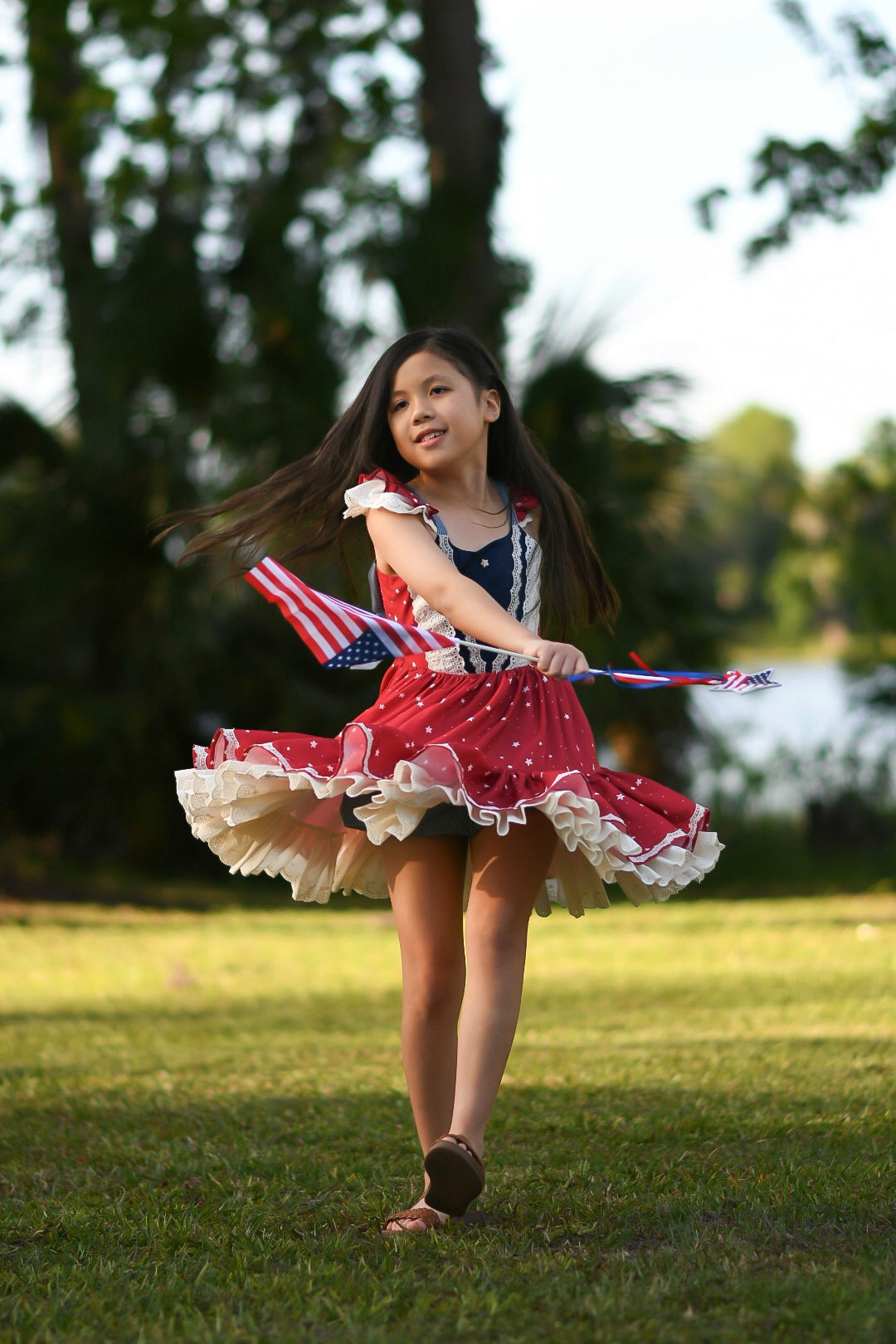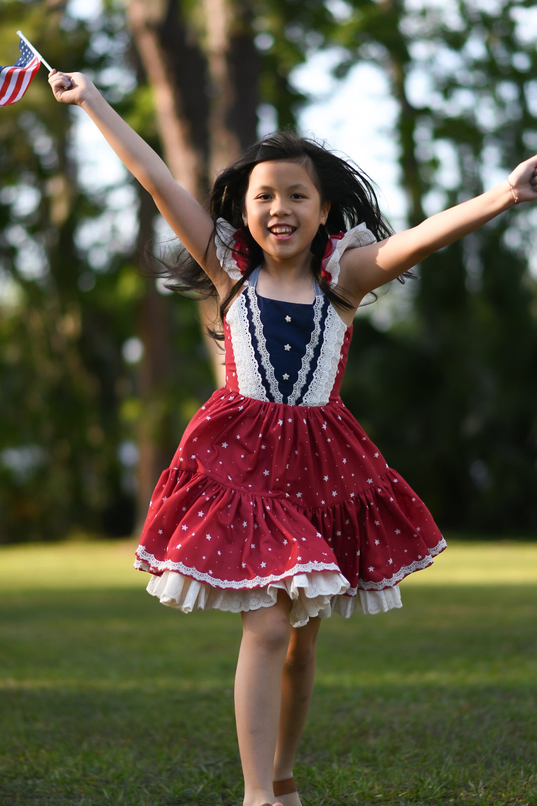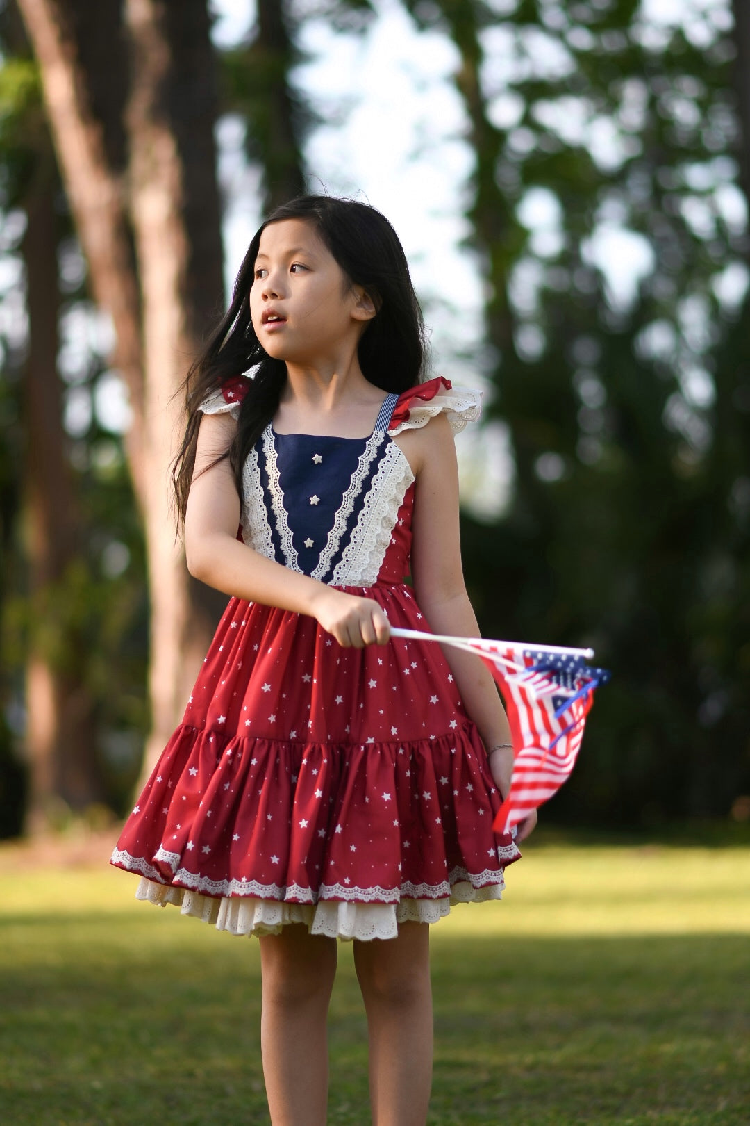 Flutter sleeves with lace trim add a sweet, feminine touch, while the full, double-tiered skirt is designed for twirling through every summer celebration—from Memorial Day to the Fourth of July and beyond.