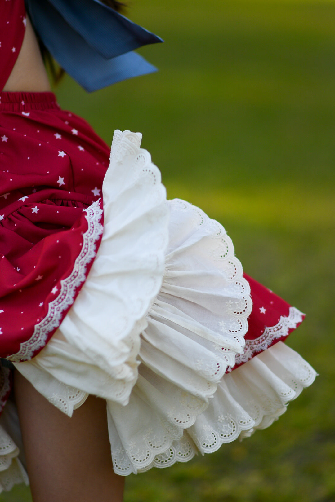 Crafted in a rich red cotton adorned with delicate white stars, this dress features our iconic V-shaped bodice, framed with layers of soft vintage cream lace that create depth, texture, and elegance. The navy center panel is accented with subtle star details, bringing a classic Americana charm to life.